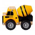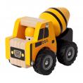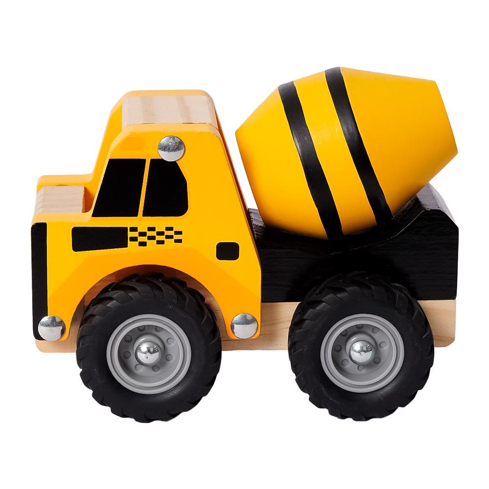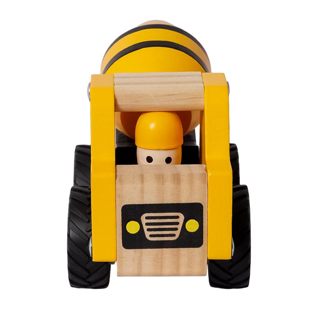 Vrolijke gele houten betonmixer met een poppetje, klaar voor spannende bouwavonturen en creatief rollenspel.
