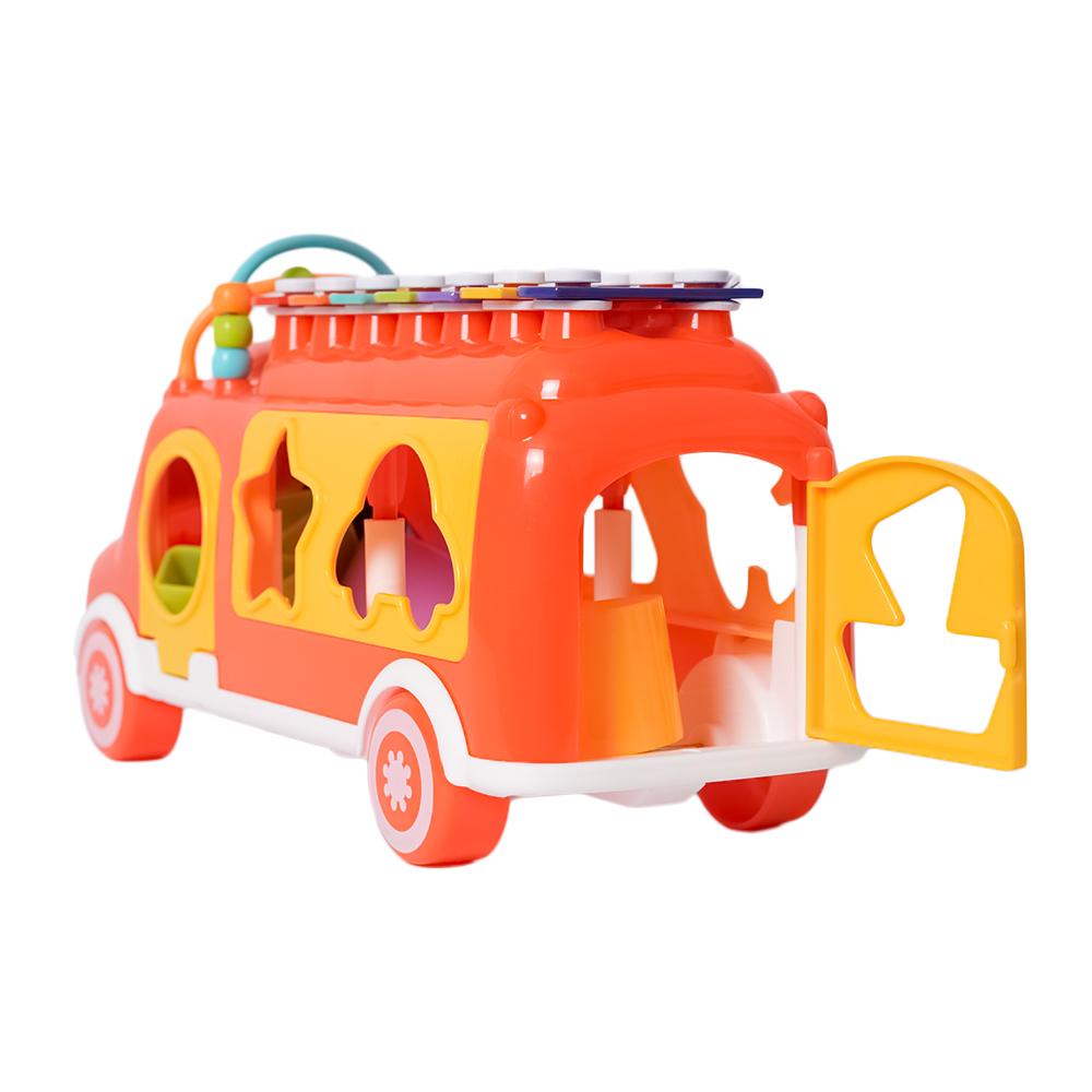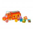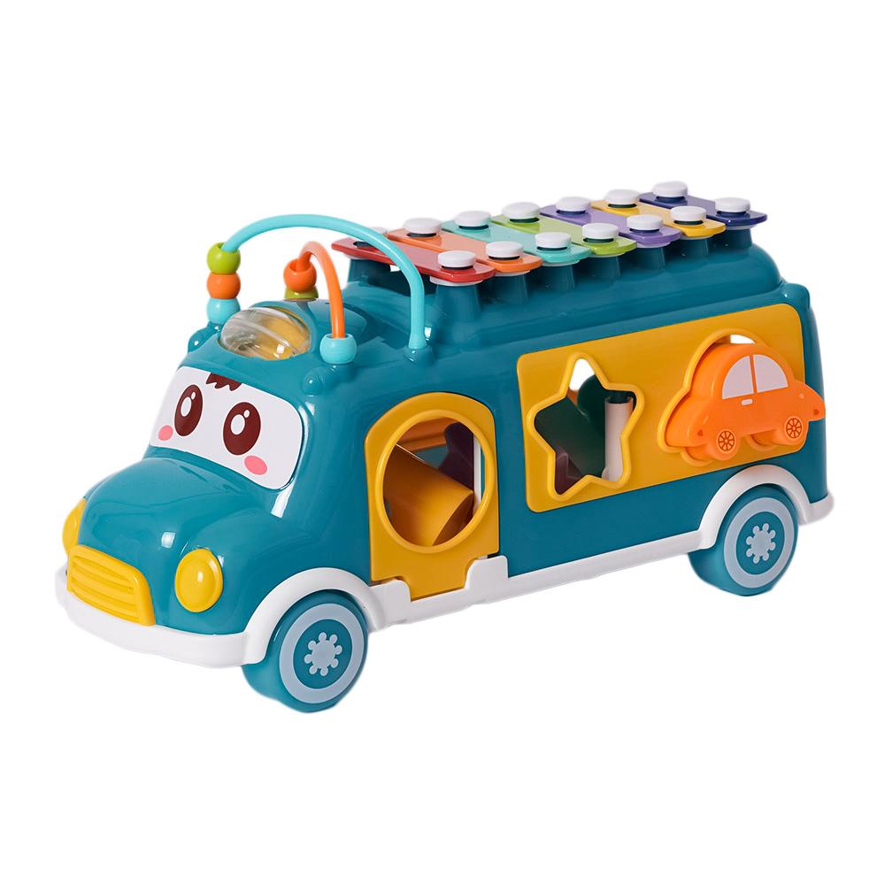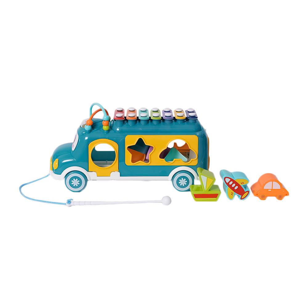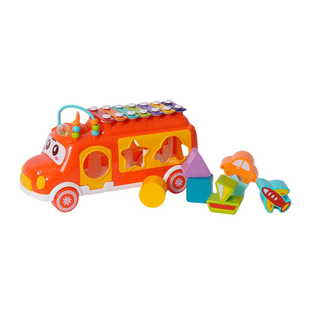 Dit vrolijke, kleurrijke busje is een echte alleskunner! In de laadruimte zit een vormenstoof waar kinderen verschillende blokjes door de juiste openingen kunnen duwen, wat hun fijne motoriek en vormherkenning stimuleert. Maar dat is nog niet alles – op het dak heeft het busje een xylofoon waarmee kinderen hun eerste muzieknoten kunnen spelen.