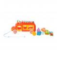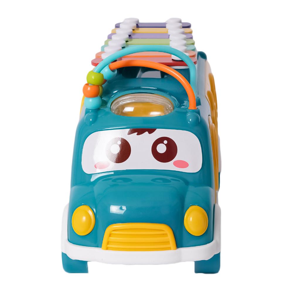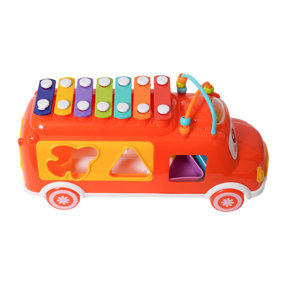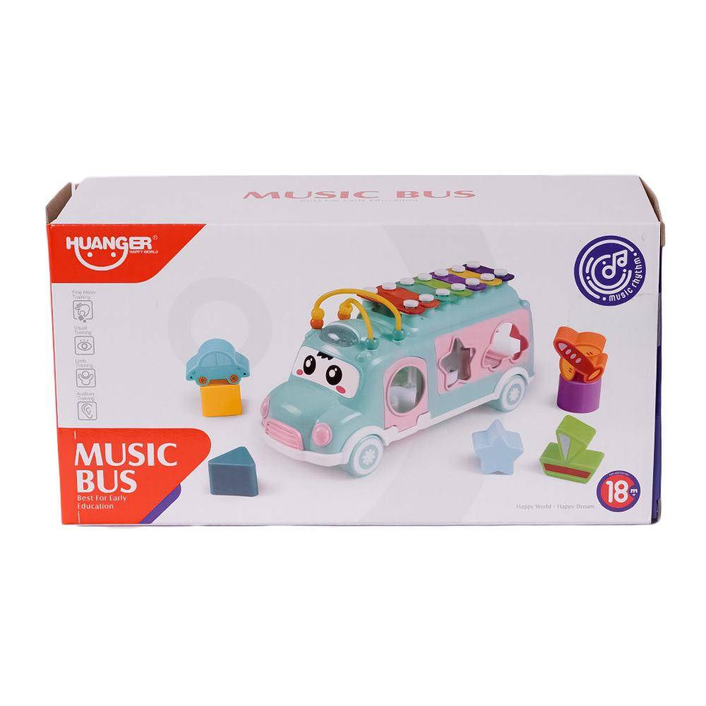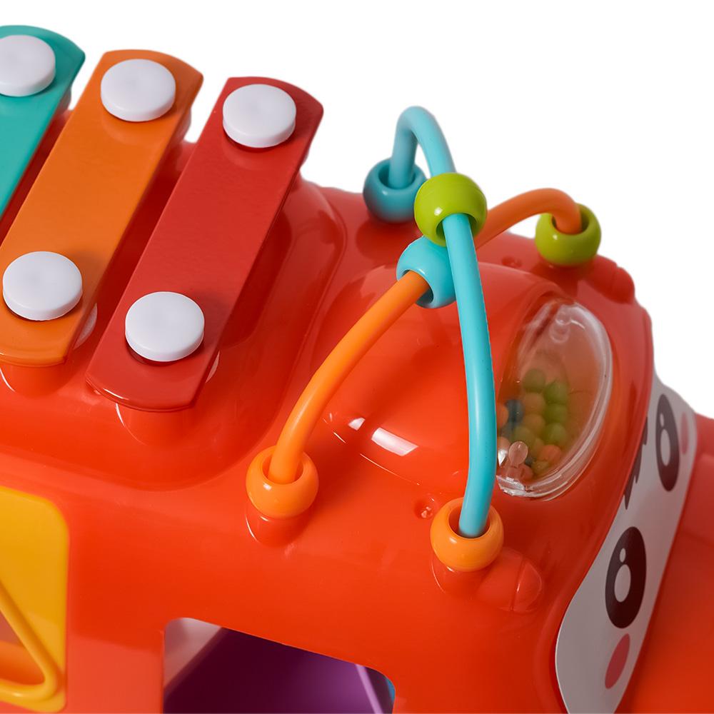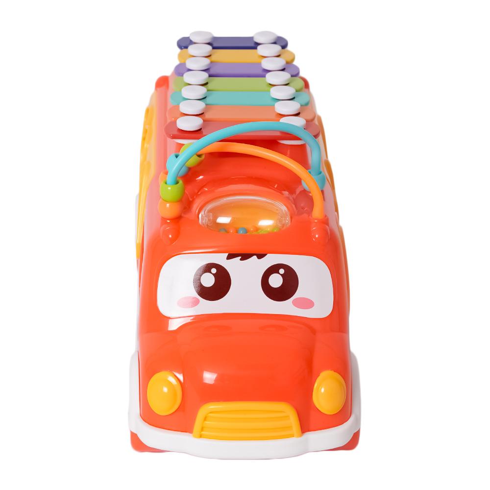 Dit vrolijke, kleurrijke busje is een echte alleskunner! In de laadruimte zit een vormenstoof waar kinderen verschillende blokjes door de juiste openingen kunnen duwen, wat hun fijne motoriek en vormherkenning stimuleert. Maar dat is nog niet alles – op het dak heeft het busje een xylofoon waarmee kinderen hun eerste muzieknoten kunnen spelen.