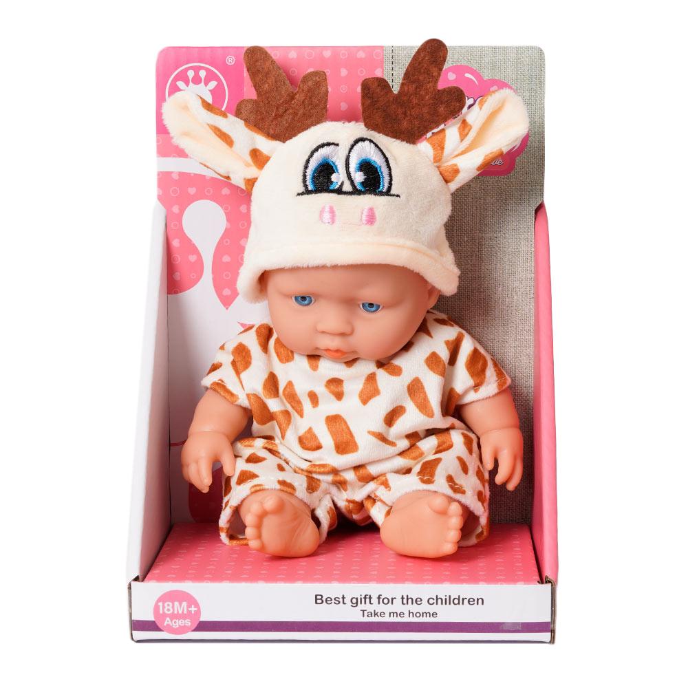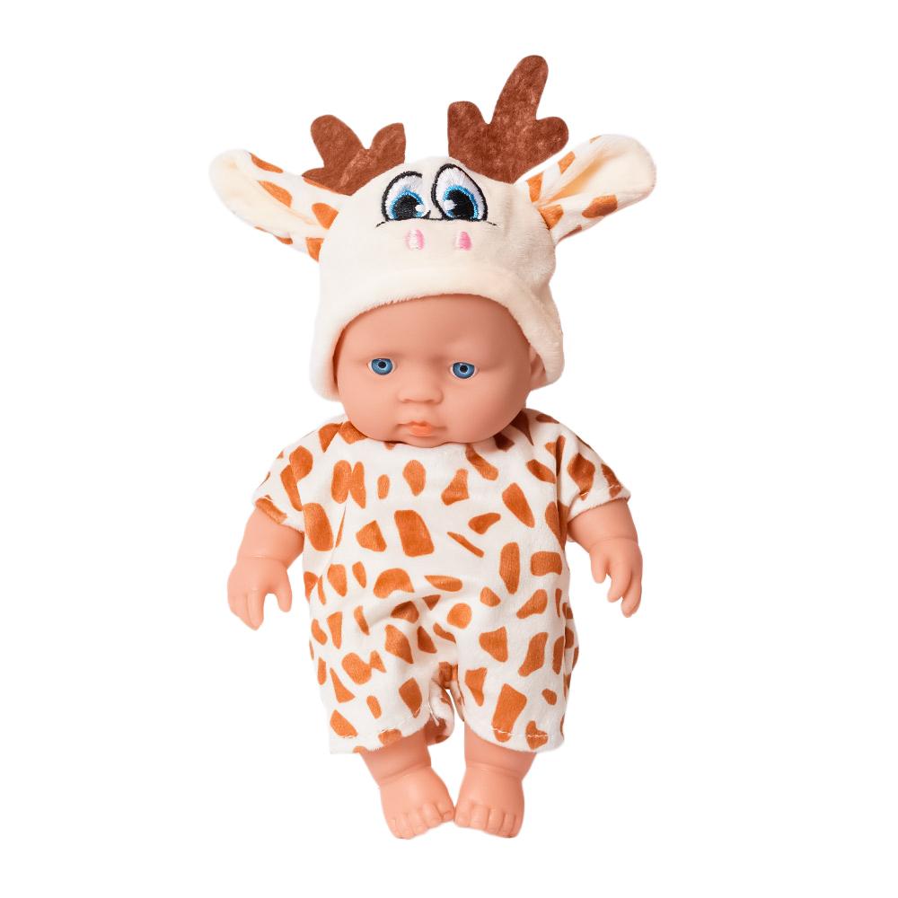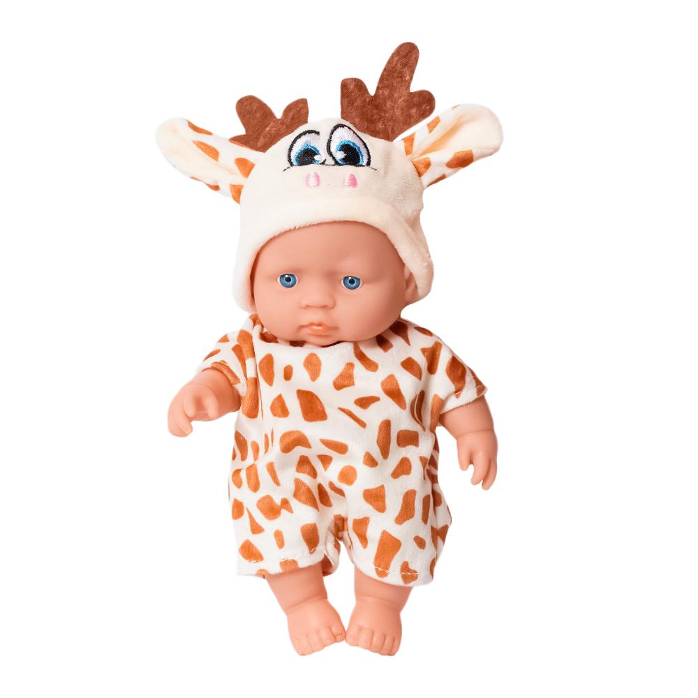 Deze schattige babypop is verkleed als een giraffe in een zachtgeel pakje met lichtbruine stipjes. Op haar mutsje staan schattige giraffenhoorns en oortjes. Een knuffelbaar vriendje voor elke kleine dierenliefhebber!