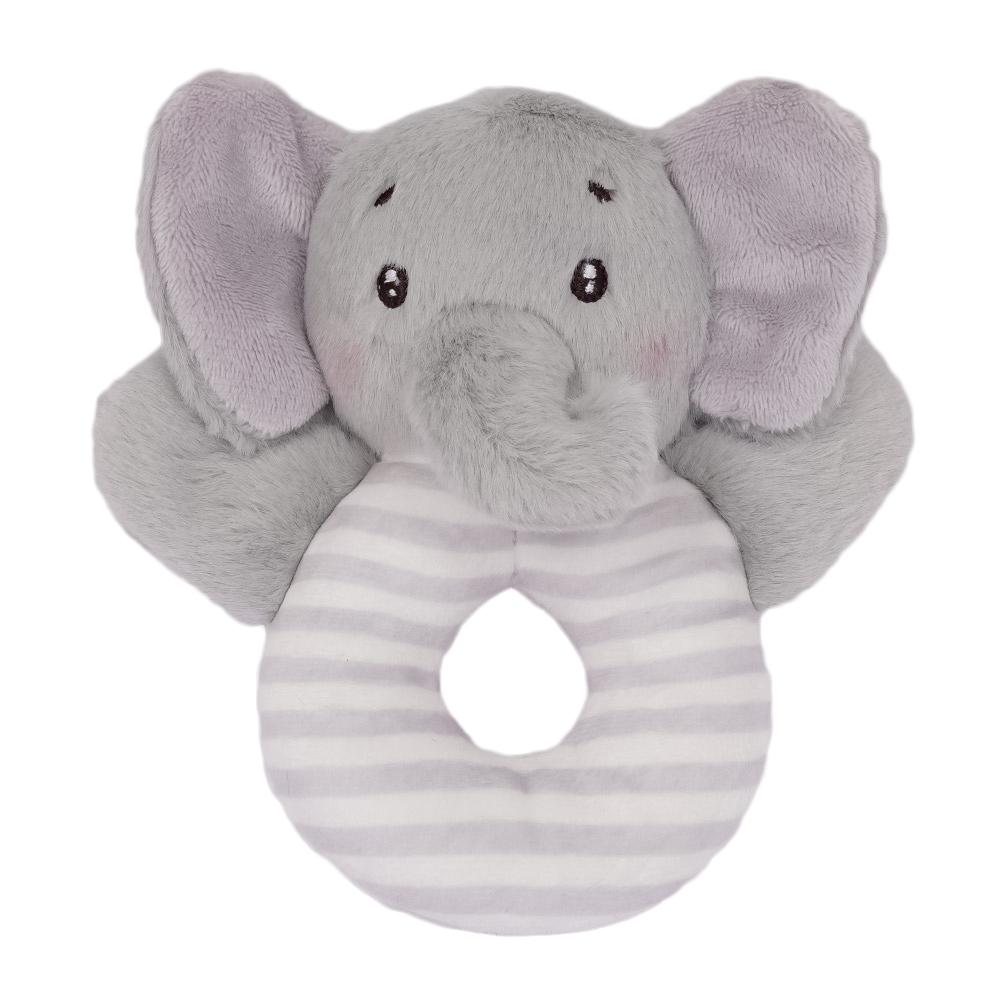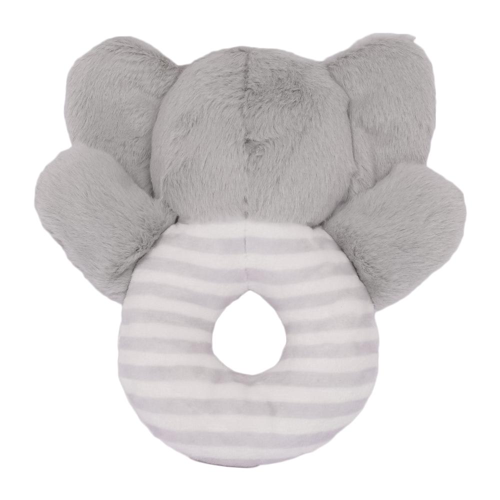 Zijn ronde, pluchen lijfje is makkelijk vast te houden voor kleine handjes en bevat een zachte rammelaar die vrolijk klinkt bij elke beweging. Bovenop de ring zit Olli’s lieve olifantenkopje, compleet met flapoortjes en een warme glimlach.