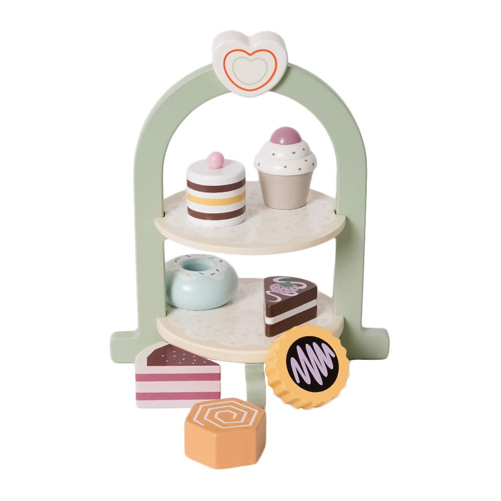 Deze prachtige houten etagère met gebakjes is perfect voor kleine bakkers en theekransjes! De set bevat een elegante etagère met verschillende kleurrijke houten gebakjes, zoals cupcakes, cakejes en taartjes. Kinderen kunnen hun eigen high tea organiseren en zo hun fantasie, sociale vaardigheden en fijne motoriek ontwikkelen.